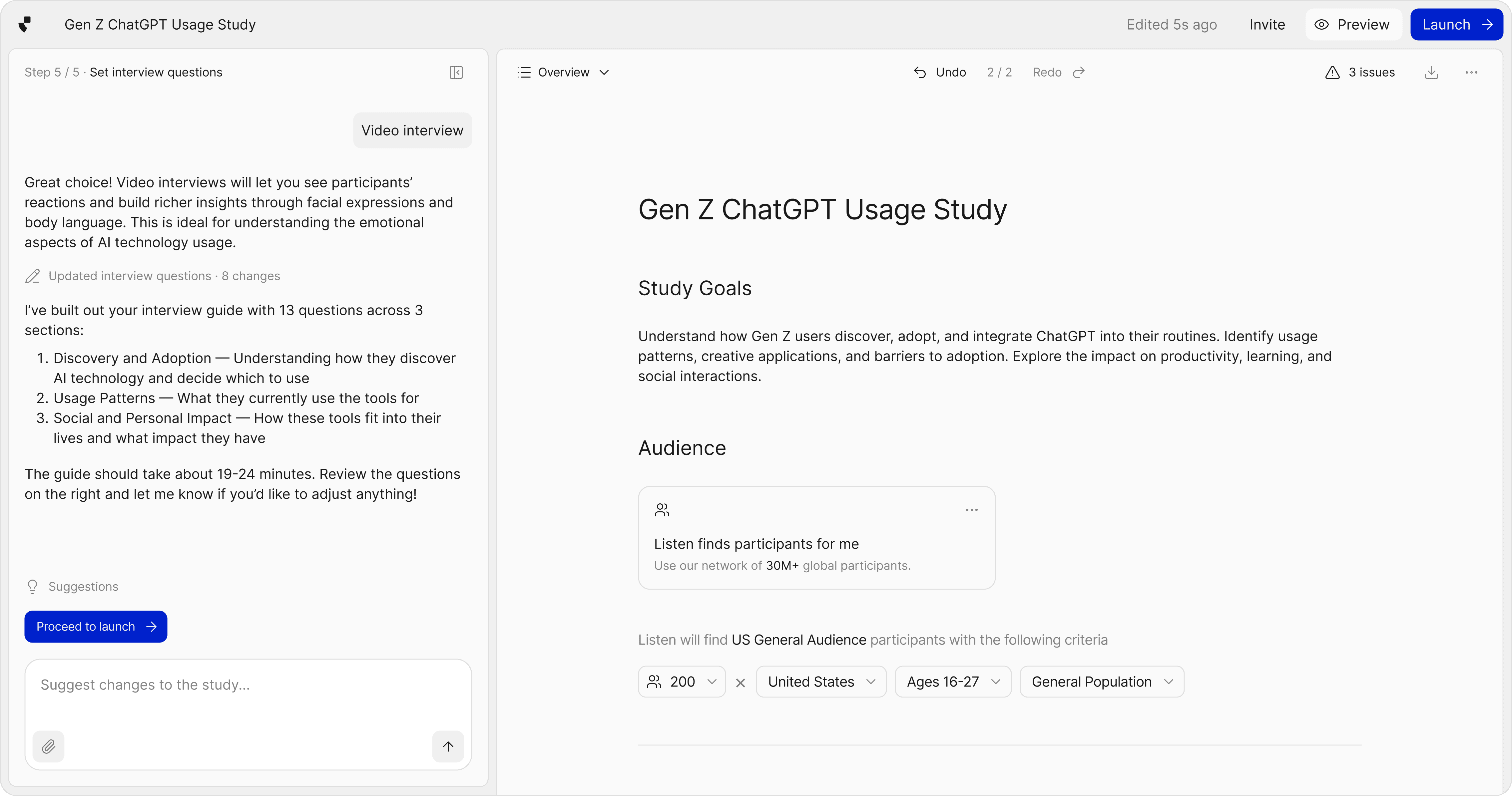 Need 50 interviews by Friday? Launch the study, watch them roll in, share findings before the next product review.